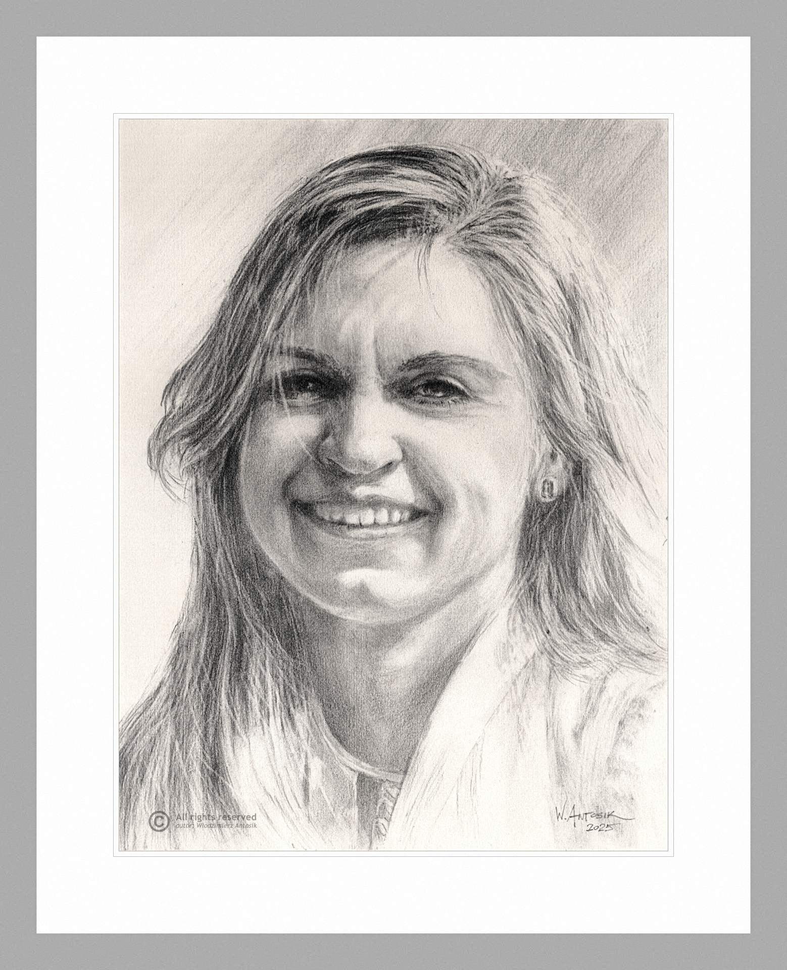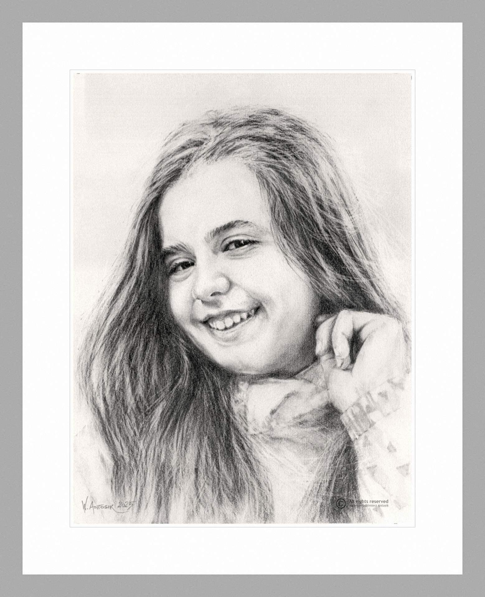 Rysunek ołówkiem 30x40 cm (11,8"x15,7"), oprawa w drewnianą szarą ramę z białym passepartout 43x53 cm. (index P002). W posiadaniu prywatnym.