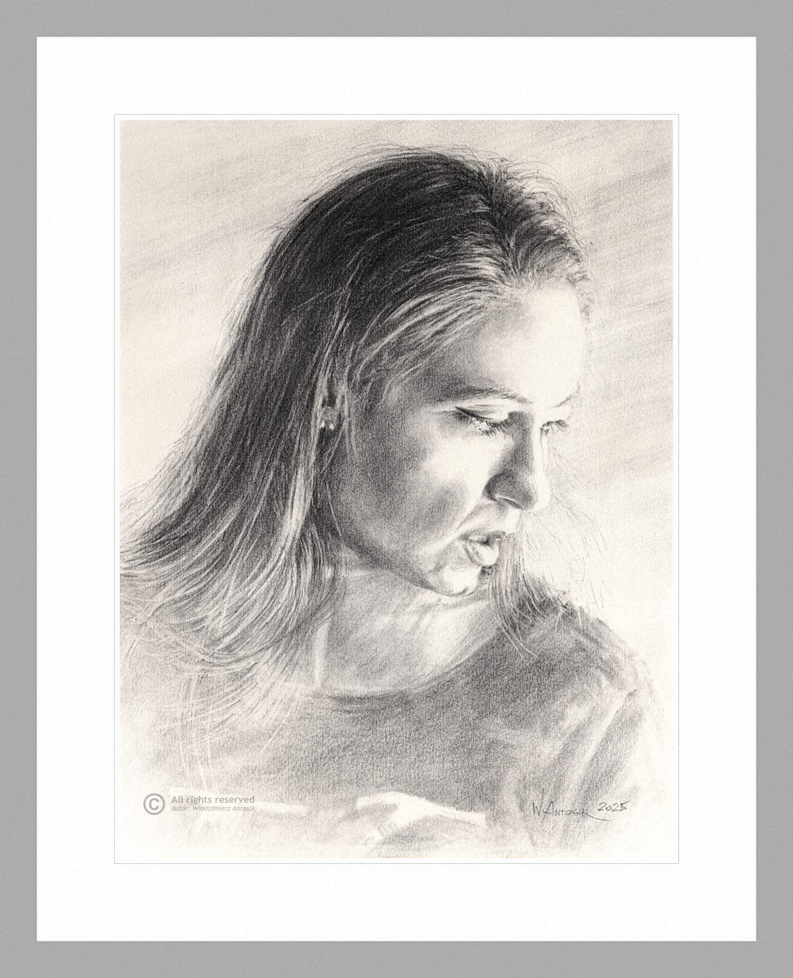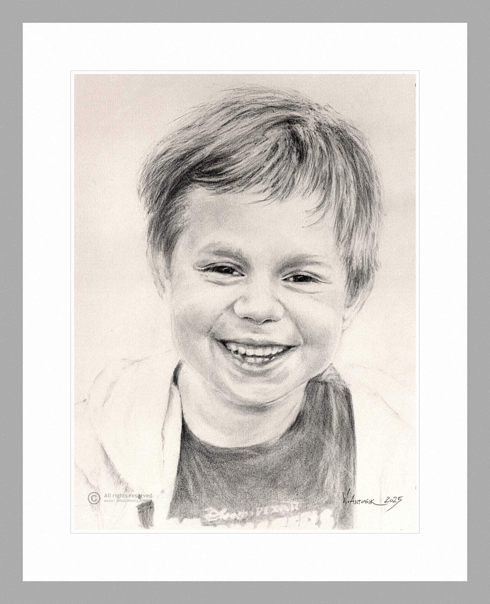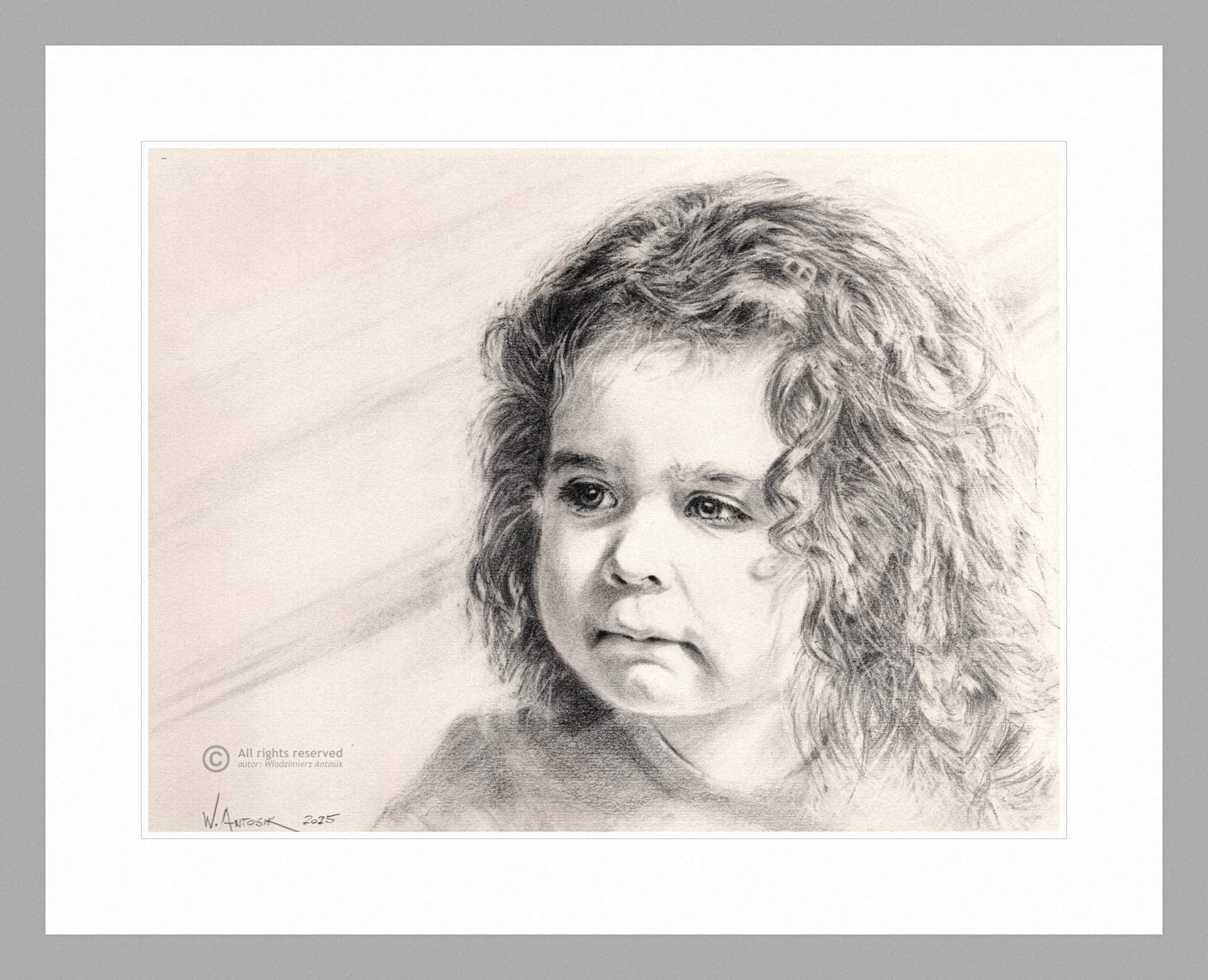 Rysunek ołówkiem 30x40 cm (11,8"x15,7"), oprawa w drewnianą szarą ramę z białym passepartout 43x53 cm. (index P001). W posiadaniu prywatnym.