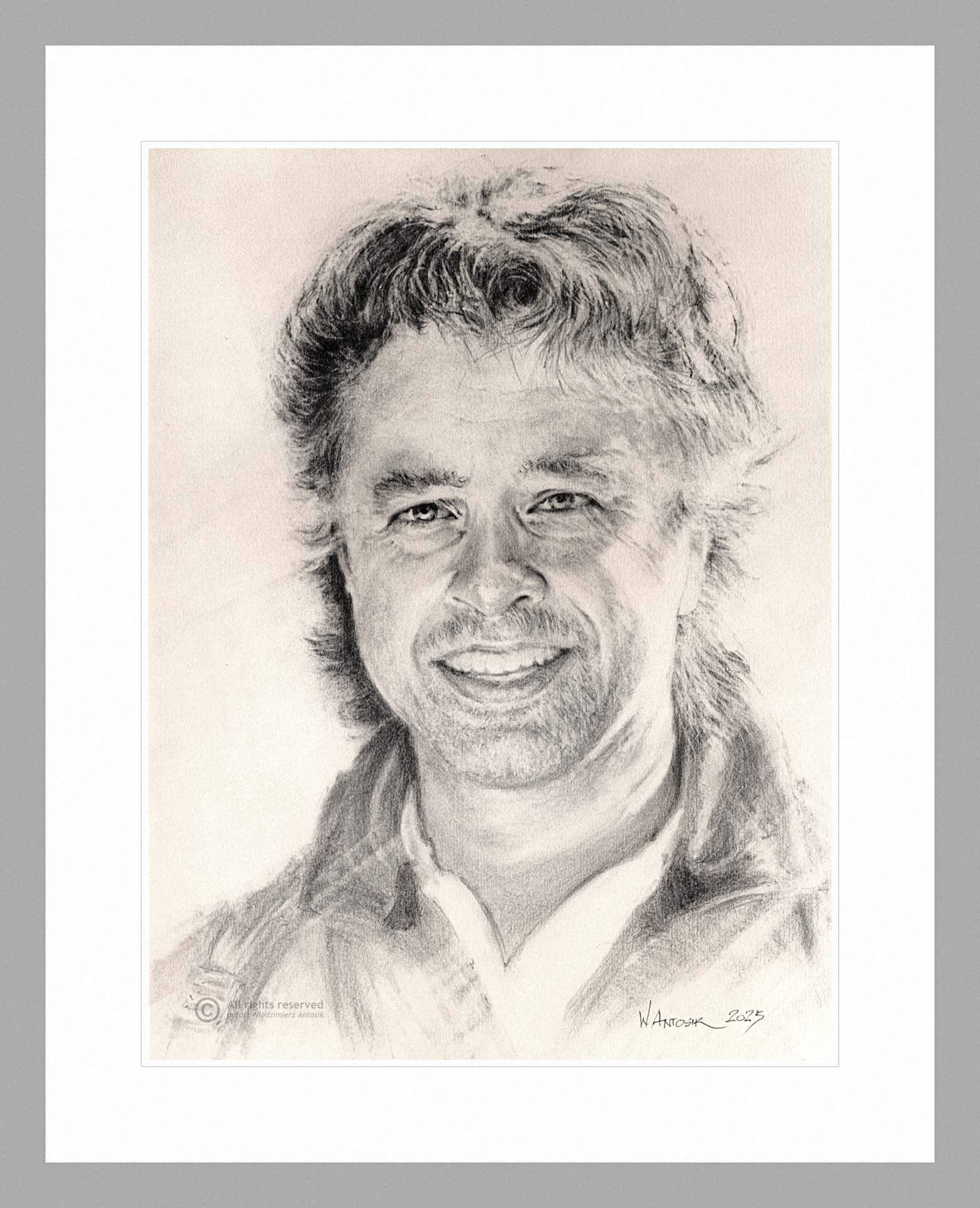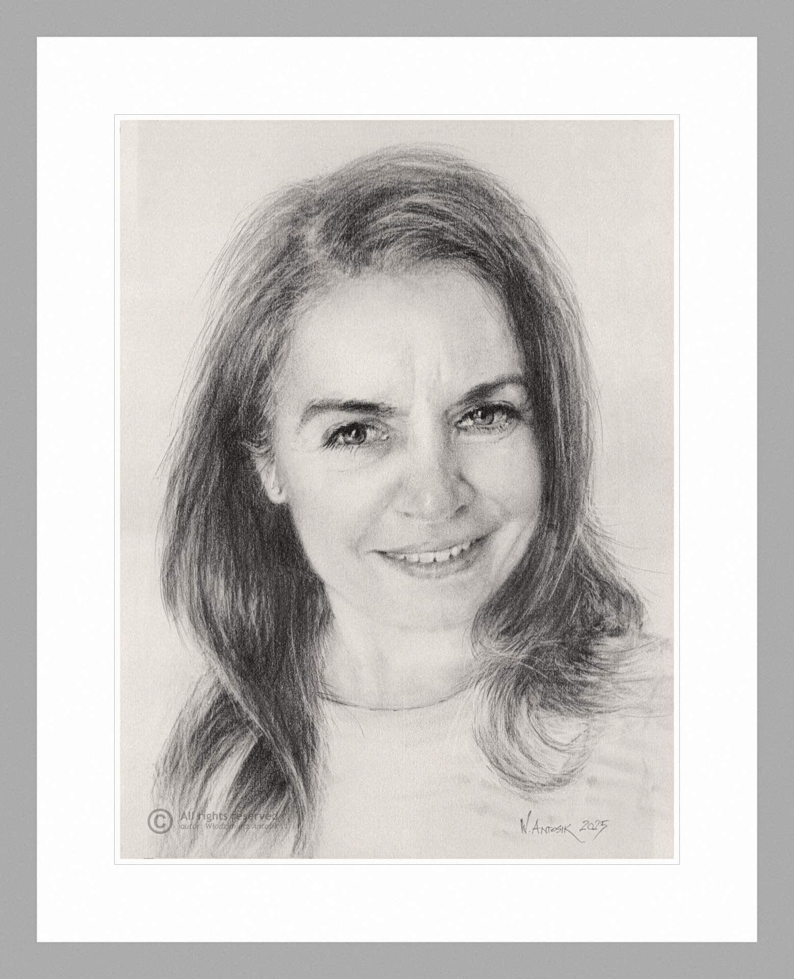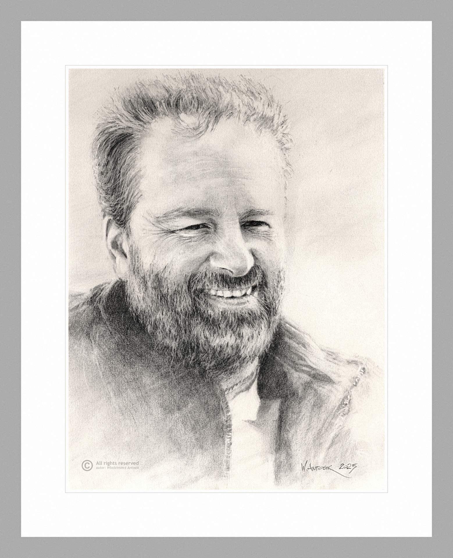 Rysunek ołówkiem 30x40 cm (11,8"x15,7"), oprawa w drewnianą szarą ramę z białym passepartout 43x53 cm. (index P001). W posiadaniu prywatnym.