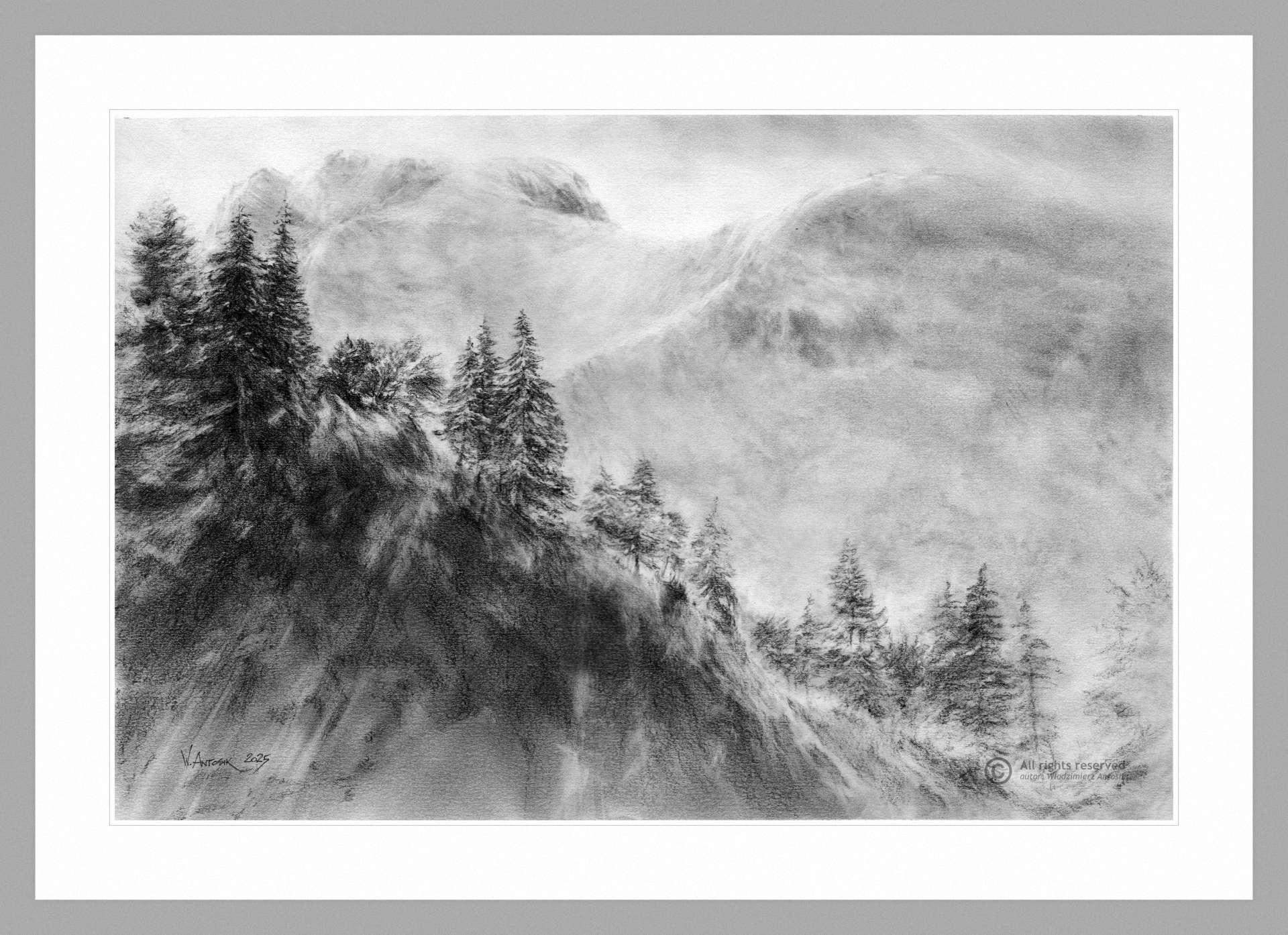 Rysunek węglem 60x40 cm (23,5"x15,7"), oprawa w drewnianą szarą ramę z białym passepartout 73x53 cm. Alpy - Austria. (index R005). Rezerwacja.