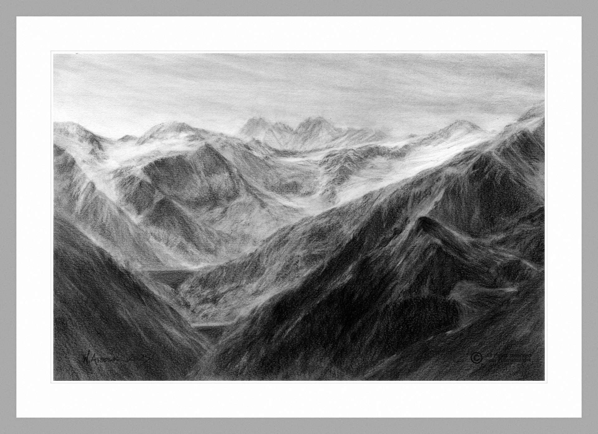 Rysunek ołówkiem 60x40 cm (23,5"x15,7"), oprawa w drewnianą szarą ramę z białym passepartout 73x53 cm. Alpy - Austria. (index R004)