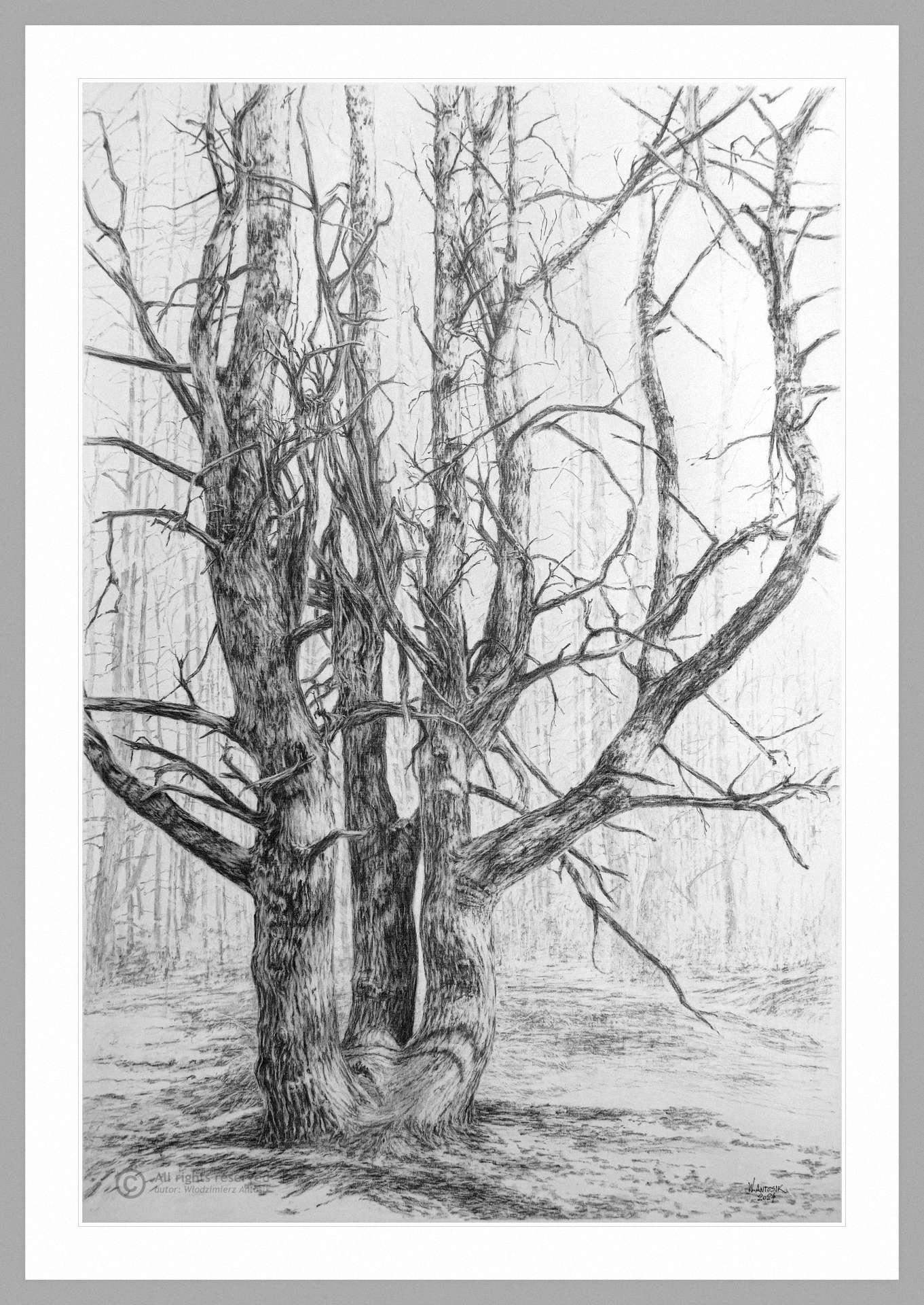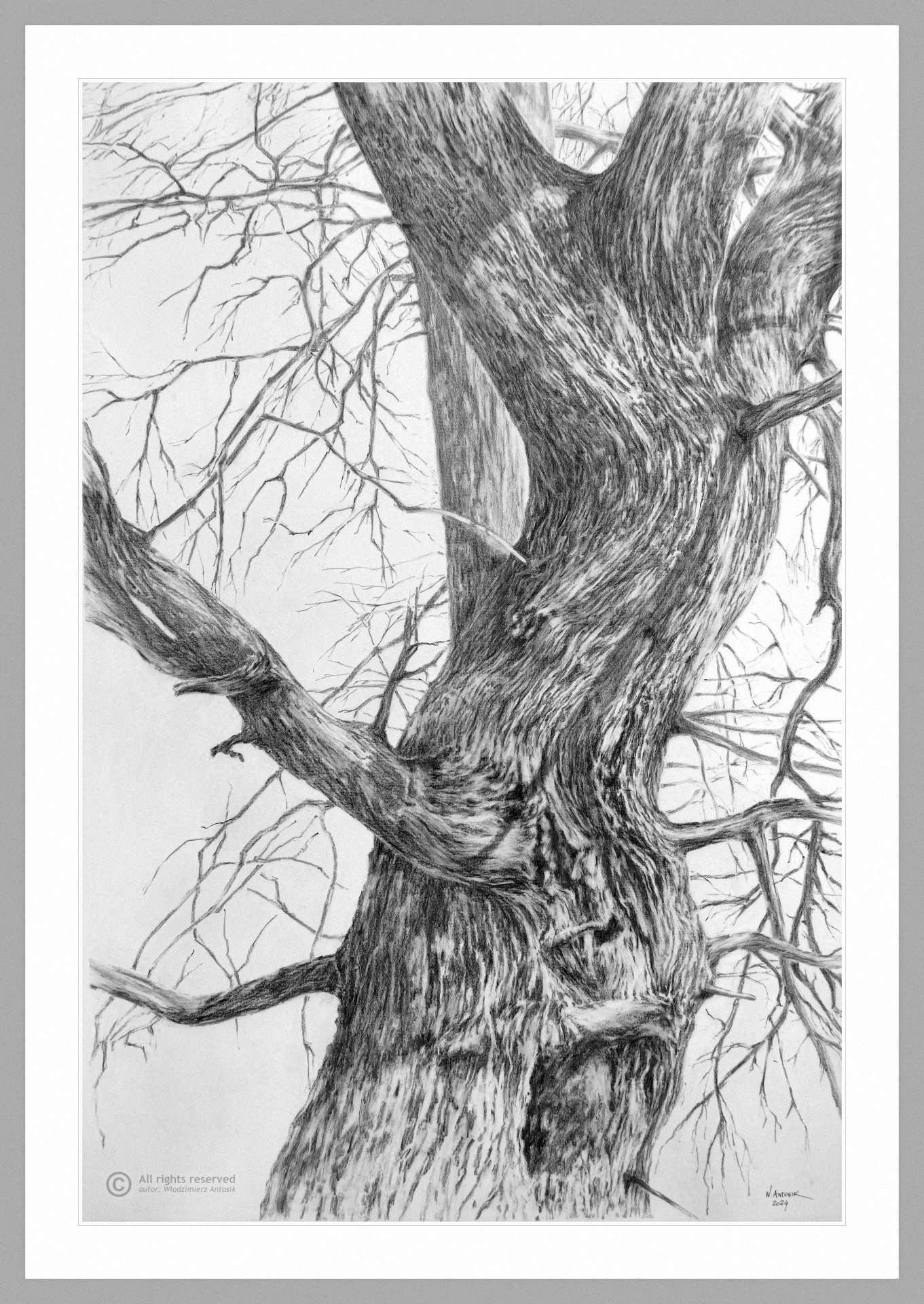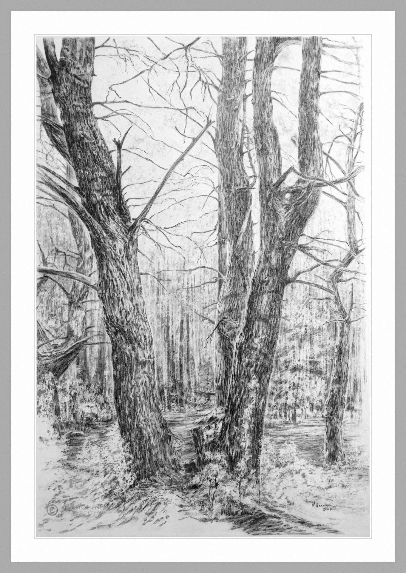 Rysunek ołówkiem 60x90 cm (23,5"x35,5"), oprawa w drewnianą szarą ramę z białym passepartout 73x103 cm. Puszcza Kampinoska - Polska. (index R003)
