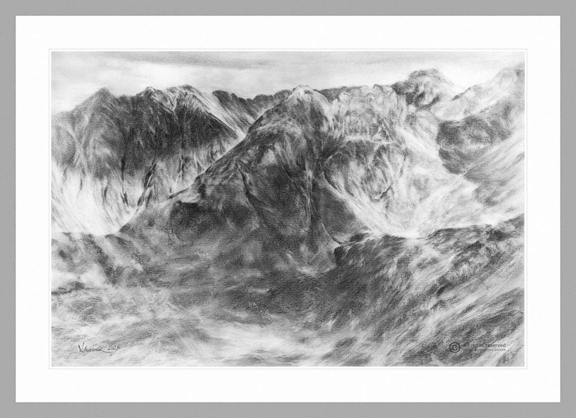 Rysunek ołówkiem 60x40 cm (23,5"x15,7"), oprawa w drewnianą szarą ramę z białym passepartout 73x53 cm. Tatry - Polska. (index R006)